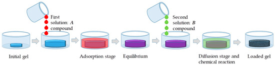 In the case of a loaded gel, this result can be achieved allowing it to absorb initially a solution of certain compound and, then, after the equilibrium has been established, a second solution of another compound, which can react with the first. As the reaction takes places, nanoparticles can be eventually formed directly within the matrix. This method is very effective and can lead to the formation of many types of particles and reduce distribution gradients. Figure 1 shows a schematic representation of the steps of this process: A partially hydrated gel is brought into contact with a solution and swells. Gels can remain in this state even when the excess solution is removed, as the liquid is absorbed. When the solution containing compound B is brought into contact with the gel, it can begin to slowly diffuse and the chemical reaction between A and B can occur locally. Eventually, the excess of the second solution is also removed, while the nanoparticles remain inside the gel.