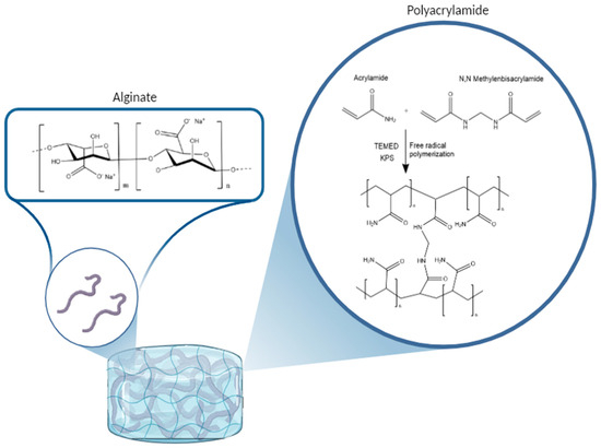 Figure 2 shows the chemical structure of alginate and polyacrylamide chains and a schematic of the chemical process leading to cross-linking and then gelation used in this case for the formation of the hydrogel [24].