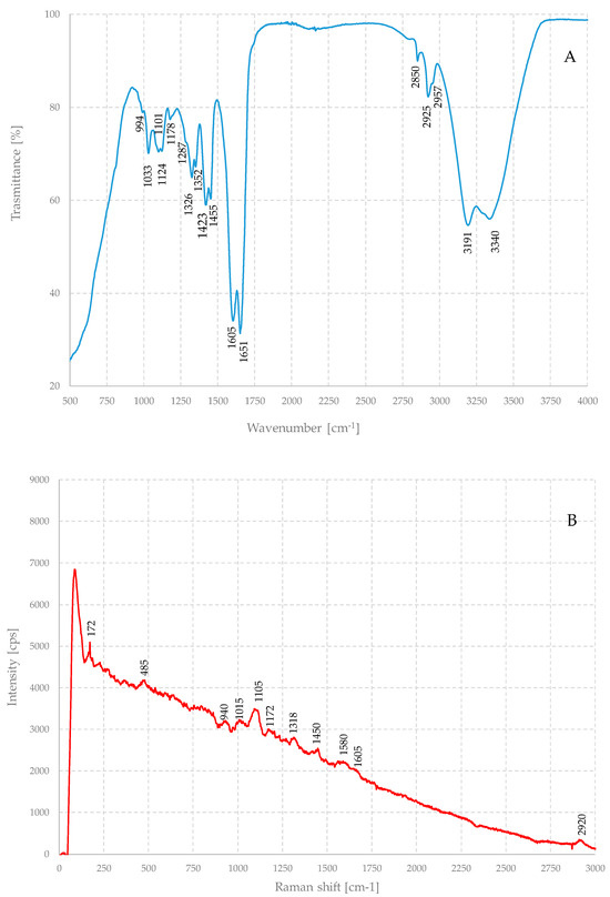 The Raman spectra of the compounds and mixtures were acquired, at room temperature, by a BWTEK i-Raman plus spectrometer (B&W Tek, Plainsboro, NJ, USA) equipped with a 785 nm laser in the range of 100–3500 cm−1 with a spectral resolution of 2 cm−1. The measurement parameters, such as acquisition time, number of repetitions, and laser power, were selected for each sample to maximize the signal-to-noise ratio. The standard acquisition, however, was 20 repetitions of 10 s each. This instrument has a maximal power of 350 mW, but in most cases, only 10% of it was used. For each spectrum, a reference acquisition was previously carried out with the same parameters to subtract the instrumental background. IR spectra were collected using a PerkinElmerSpectrum Two FT-IR Spectrometer (PerkinElmer, Waltham, MA, USA), equipped with room-temperature LiTaO3 (lithium tantalate) MIR detector with a SNR of 9300:1 with a best resolution of 0.5 cm−1 between 450 cm−1 and 4000 cm−1 and measuring the transmittance of the sample.