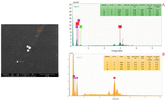 EDS analyses were performed in several areas to determine the composition of these particles. Since they are very small in size, it is impossible to measure their chemical nature and that of the matrix separately; however, the presence of silver is evident. Figure 6 shows a typical EDX spectrum carried out on a large particle (Figure 6A) and in a small area (Figure 6B).