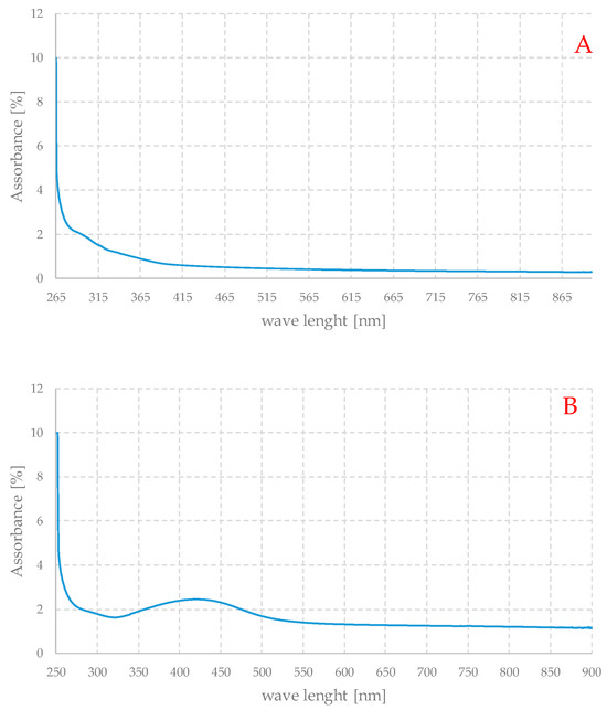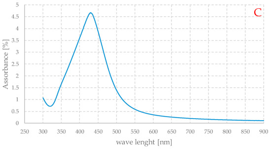 The spectra thus obtained should be understood as qualitative, because some important factors such as concentration are not known. Nevertheless, Figures B and C show the typical appearance of the UV spectra of silver nanoparticle-based systems. Spectrum A shows a strong absorption below about 250 nm, which evidently corresponds to the electronic transitions of the organic component of the material. Spectrum B is very similar to the previous one, with the same type of absorption at high energies, but a peak centered at about 420 nm is also evident, while in spectrum C, since the organic component is absent, this absorption signal is not present, but only a peak in the same range as in the case of the loaded gel. The maximum is at slightly shorter wavelengths, but the two curves are generally quite similar. The spectrum of the loaded gel exhibits a non-zero absorbance, but practically independent of the wavelength between 550 and 900 nm. This can be due to the weak absorption of the organic part of the material and to the scattering of light due to the particles themselves. This can also account for the very dark color of these gels.