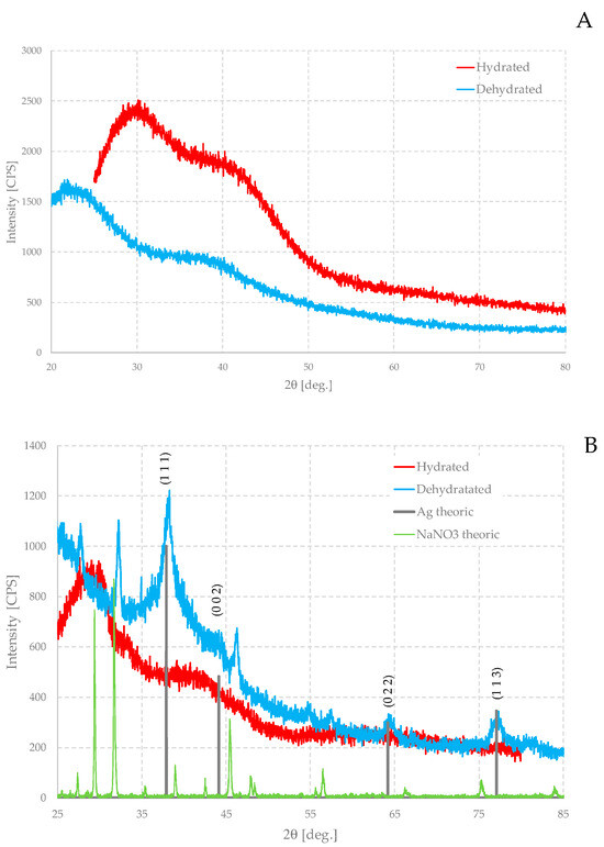 The XRD pattern of the dehydrated sample is very different from the others. Also, in this case, there is a component in the diffractogram due to the amorphous matrix and, as in the case of the pure gel, the absence of water causes the humps to shift to smaller angles, but the main feature is the presence of some quite wide peaks. Evidently, the absence of water increases the ratio of the mass of the particles to the rest of the matrix so that their signals are recognizable. These peaks can be readily assigned to metallic silver as well as sodium nitrate (NaNO3), which forms as an additional product in the oxidation–reduction reaction. It is a very soluble salt and, therefore, in any case, not detectable in the hydrated gel, but when the water is removed, it too is forced to crystallize inside the gel. Silver peaks may also be present in the hydrated sample, but they are so weak that they are confused with the noise of the curve.