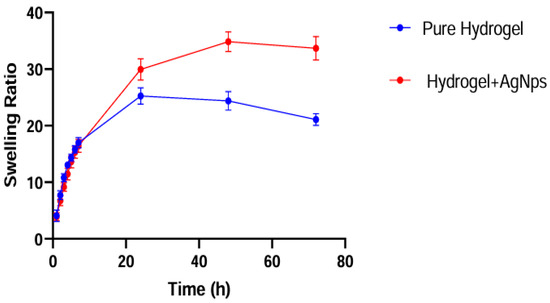The swelling behavior is shown in Figure 11: The gels were first completely dehydrated, leaving them in an oven at 40 °C for at least one week, and then immersed in distilled water to allow them to reabsorb it. Samples of approximately 0.1/0.2 g 1 cm × 1 cm were immersed in 40 mL of distilled water, changing it every time, and weighed after fixed intervals.