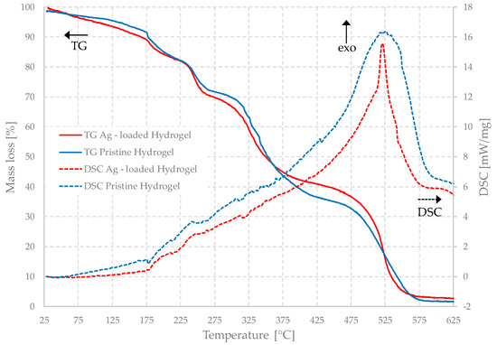 The silver nanoparticles were prepared by submerging the hydrogel in a 20 mL solution of AgNO3 (10 mM) (purchased by Carlo Erba Reagents, Milano, Italy) for 24 h at room temperature to complete the diffusion inside the gel structure. It can be assumed that, after this period a uniform distribution of metal cations inside the gel is achieved. After 24 h, the gels were removed from the container, their surface cleaned, and the residual drops of saline solution present on it were removed and then they were re-immersed in a 5 mM NaBH4 (purchased by Merck KGaA, Darmstadt, Germany) solution for an additional 24 h. During this stage, the samples were kept at different temperatures, ranging from 5 °C and 70 °C. Finally, the gels are removed from the liquid so that they could be analyzed. The concentrations of the reagent solutions and all other parameters were kept fixed in all experiments, so that only the effect of temperature alone could be investigated. For characterizations, the gels were dehydrated by leaving them for a few days at 40 °C.