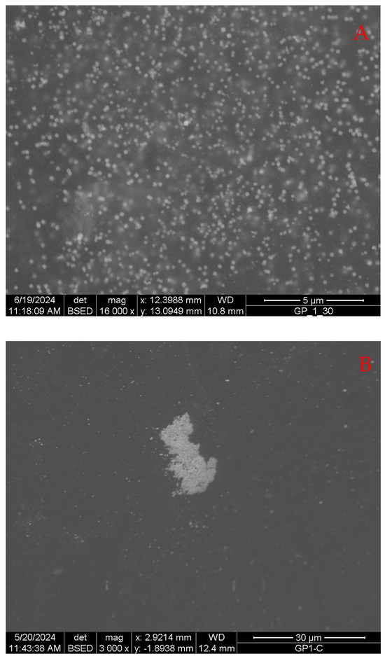 Nanoparticles are formed because of the oxidation–reduction reaction between silver nitrate and sodium borohydride. The former is commonly used as a starting reagent for the synthesis of nanoparticles, even in complex matrices, and not only in the case of dispersions in water [31,32], while the second one is a well-known powerful reducing agent [33,34].