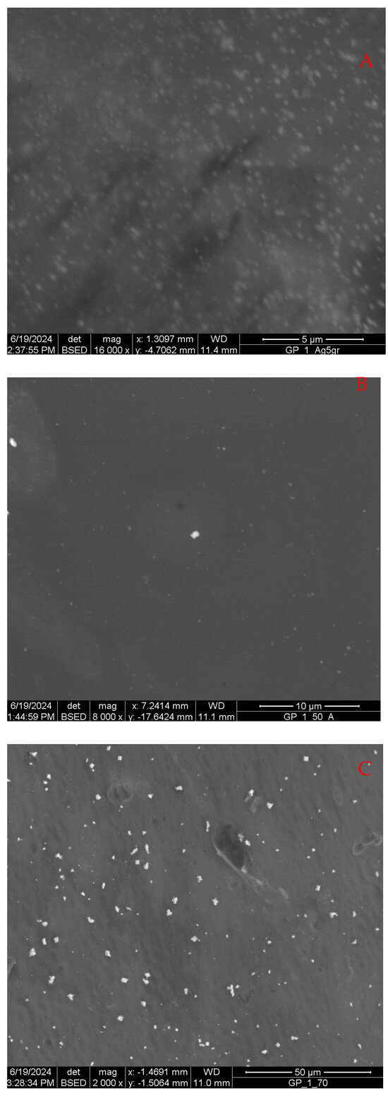 SEM images of Ag-loaded samples, prepared at 5 °C (A), 50 °C (B), and 70 °C (C).