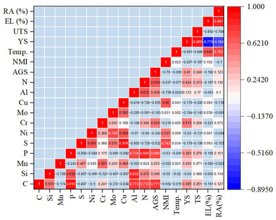 The correlation coefficient of any parameter with itself is always +1, which appears along the diagonal of the heatmap. While detailing the correlation of each element with others is beyond the scope of this paper, the overall trends can be easily observed through the color variations in the heatmap. Sulfur and phosphorus form non-metallic inclusions [31], indicated by the red color in the heatmap, signifying a strong relationship between these elements and non-metallic inclusions.
