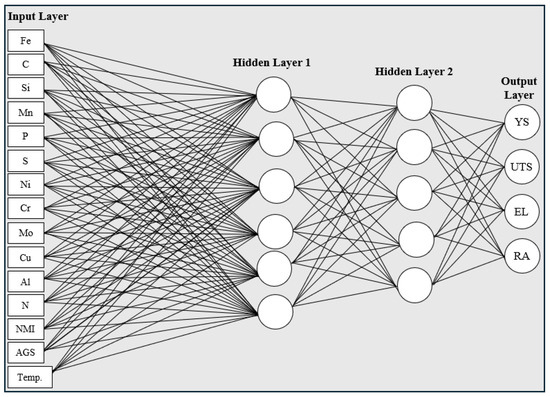ANN modeling is inspired by the human brain, where interconnected neurons adjust their responses based on inputs. In an ANN, there are typically three layers: input, hidden, and output layers. This model’s input layer includes composition, non-metallic inclusions, austenite grain size, and temperature. The outputs are YS, UTS, El (%), and RA (%). The hidden layers, positioned between the input and output layers, contain a certain number of nodes. Part of the data is used to train the ANN, enabling it to produce highly accurate outputs from new, unknown inputs. The model is trained by adjusting the network to align the computed outputs with the experimental values. The primary focus during model training is on minimizing the mean squared error (MSE), which represents the average error in output predictions (Etr), calculated by using Equations (3) and (4) [33].