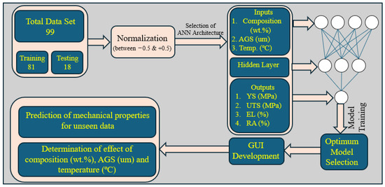 Figure 3 presents a comprehensive flowchart of the investigation using the developed model. It outlines the process of data division into training and testing sets, normalization of values, operation of the ANN within hidden layers, selection of the optimal model, and subsequent accuracy determination and prediction of mechanical properties for unseen data.