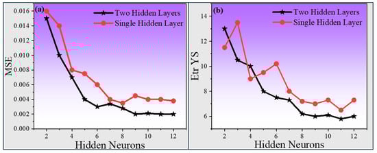 Effect of the number of hidden layers and neurons on: (a) MSE and (b) Etr YS. The black line is for a single hidden layer, and the red line is for two hidden layers.