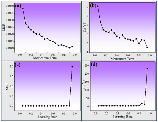 Effect of various parameters on prediction error: (a) effect of momentum term on MSE, (b) effect of momentum term on Etr YS, (c) effect of learning rate on MSE, and (d) effect of learning rate on Etr YS.