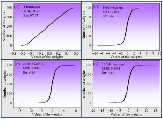 Change in the magnitude of weights at (a) 0, (b) 1000, (c) 4000, and (d) 10,650 iterations.
