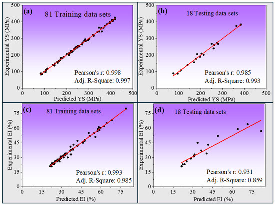 Graphical representation of predicted and experimental values of (a) YS (MPa) for the training dataset, (b) YS (MPa) for the testing dataset, (c) El (%) for the training dataset, and (d) El (%) for the testing dataset.