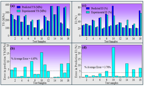 Graphical representation of (a) predicted and experimental values for YS (MPa), (b) % error in predictions for YS (MPa), (c) predicted and experimental values for El (%), and (d) % error in prediction for El (%).