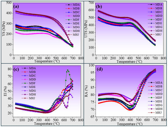 Graphical representation of the predicted effect of temperature change on mechanical properties for (a) YS (MPa), (b) UTS (MPa), (c) El (%), and (d) RA (%) for all the steels studied in the present work. The labels such as MDA, MDB, etc. represent the distinct steel composition in the NIMS dataset.