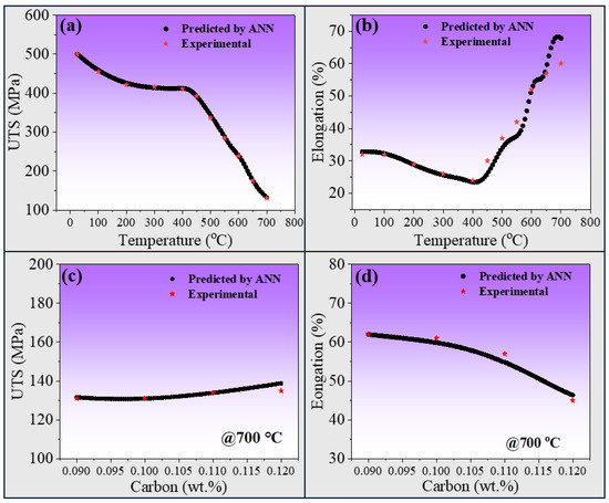 Effect of temperature (°C) on (a) UTS (MPa) and (b) elongation (%). Effect of carbon content (wt.%) on (c) UTS (MPa) and (d) elongation (%) at a temperature of 700 °C. The red stars show the experimental values, whereas the black dots are the values predicted by the ANN.