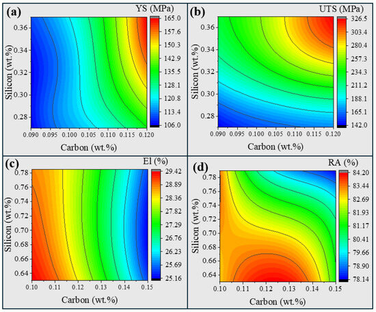 Contour maps showing combined effects of C (wt.%) and Si (wt.%) on (a) YS (MPa), (b) UTS (MPa), (c) El (%), and (d) RA (%).