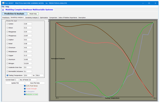 The developed ANN model has been integrated into a user-friendly GUI, featuring fourteen input parameters and four output parameters (predicted YS, UTS, EL, and RA). Users can manually adjust the input parameters and calculate all four outputs with a single button click. For linear visualization, there is a button to select the desired seed and another to save the plot. Users can save the plot data to a new file, with the number of points customizable. Surface plots, which show the combined effect of multiple inputs, can also be generated similarly for easy visualization and understanding. Additionally, bar plots displaying both input and output parameters are accessible on the same screen with a single click. Input values can be adjusted by clicking and dragging the respective bars. This makes the model highly intuitive and easy to use. We have included one screenshot of the GUI of our developed model, as shown in Figure 12. Figure 12 provides a detailed visualization of how mechanical properties change with temperature. The calculations allow users to observe subtle variations and trends by displaying temperatures at finer intervals. The predicted mechanical properties are presented on a normalized scale, making comparing and analyzing the data across different conditions easier. This feature enhances the usability and interpretability of the model, facilitating more precise and informed decision-making in materials engineering.