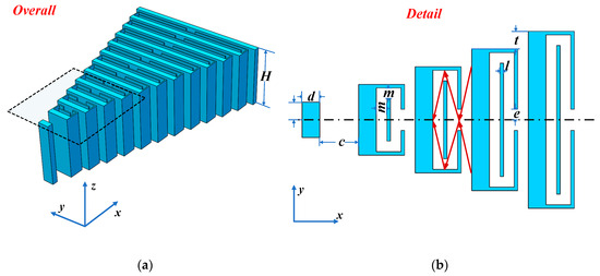 By analyzing the linear profile gradient structure proposed by Chen et al. [24], it is observed that the phenomenon of acoustic rainbow trapping occurs when the acoustic impedance between the slits of the gradient structure satisfies a condition of gradual increase. Therefore, this article proposes to construct acoustic effective media within the slits to modulate the impedance of each gap, ensuring that it satisfies the criteria for linear variation. The structure consists of an array of 13 rectangular plates, as illustrated in Figure 1a, with an amplified view of a coiling cell provided in Figure 1b. The center of the first plate is set as the origin of the coordinate system. Each plate has a thickness of d = 5 mm, and the gaps between the plates are set to c = 11 mm. The metamaterial sample is fabricated using 3D printing technology with photosensitive resin (modulus of 2.65 GPa, density of 1130 kg/m3), and the height of the sample is set to H = 55 mm. The length of the first rectangular plate from the centerline is L1 = 5 mm, and the lengths of the subsequent rectangular plates increase linearly by t = 5 mm from the centerline. A labyrinthine grid structure is established between the plates, with a width of l = 1 mm and an internal channel width of m = 3 mm. The distance of the first slit from the centerline is set to e = 3 mm. All parameter settings are summarized in Table 1. It is important to note that the selected parameters are appropriate values within a specific range, which facilitate the representation of the structural characteristics and ease of processing and experimental measurement. In practical applications, these parameters can be adjusted to customize the required gradient structure. Furthermore, the 3D printing process was performed with a print resolution of 50 μm to ensure the precision and surface smoothness of the structure, details that further enhance the acoustic properties of the structure.