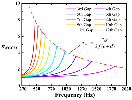Due to the addition of the coiling structure between the plates in the ZCGM, compared to the GAM structure, the effective refractive index and equivalent mass density between the plates increase, while the bulk modulus decreases. When these parameters are substituted into Equations (5) and (6), this results in an increase in both and . Furthermore, it is important to note that cannot be an arbitrarily large value. The maximum wave vector is defined as , which corresponds to the boundary of the first Brillouin zone in a periodic system [32]. Consequently, the maximum effective refractive index is determined as , where is the effective sound speed in the Z-shaped corridor, which is limited by the periodicity of the metamaterial structure of . This introduces a spatial cutoff condition where there is a cutoff distance along the direction of wave propagation. At the cutoff frequency , the refractive index reaches its maximum, and the pressure gain is maximized. When , sound wave propagation is prohibited. When is considered constant, there exists a corresponding maximum frequency . When , high-frequency sound signals are obstructed by the current grating, preventing further propagation of sound waves.