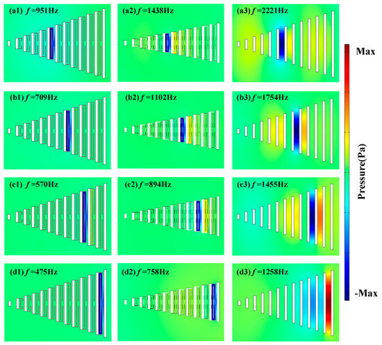 Simulation results of sound pressure distribution for three different structures at various frequencies: (a1–d1) ZCGM structure (t = 5 mm) at frequencies of 951 Hz, 709 Hz, 570 Hz, and 475 Hz; (a2–d2) ZCGM structure (t = 3 mm) at frequencies of 1438 Hz, 1102 Hz, 894 Hz, and 758 Hz; (a3–d3) GAM structure at frequencies of 2221 Hz, 1754 Hz, 1455 Hz, and 1258 Hz.