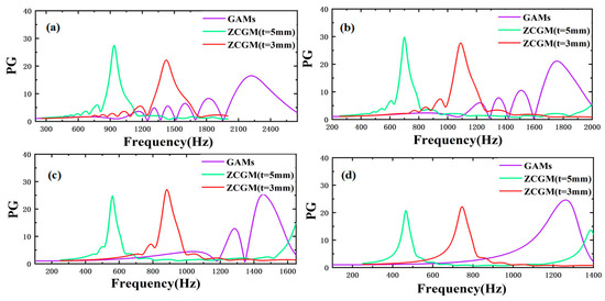 Absolute sound pressure gain between different air gaps for the ZCGM structure (t = 5 mm) and (t = 3 mm) as well as the GAM structure: (a) the sixth air gap; (b) the eighth air gap; (c) the tenth air gap; (d) the twelfth air gap.