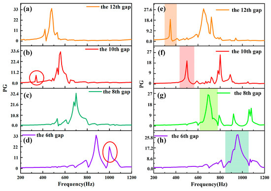 Acoustical frequency response diagram of ZCGM constructed with different materials at 12, 10, 8, 6 gaps: (a–d) steel; (e–h) photosensitive resin material.
