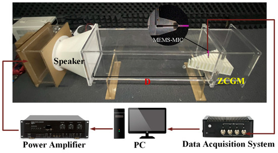 To validate the perceptual performance of the proposed ZCGM structure in response to various special signals in practical applications, an experimental test was conducted. A prototype of the proposed metamaterial was fabricated based on the geometric parameters outlined in Table 1, as illustrated in Figure 7. The prototype was 3D printed using photosensitive resin, with the base securely connected using the same material. A remote-control system was employed to input harmonic signals to the speaker via a wireless network. The speaker emitted the acoustic signals. The sound measurement device used in this study was a MEMS microphone (model: S15OT421-005, sensitivity: −42 dB, gain: 66), which was positioned at the edge of the central cavity to detect the sound signals. When the MEMS microphone was in operation but not detecting sound signals, the output voltage fluctuated around 1.5 V. The probe cross-sectional area of the MEMS microphone (3.06 mm2) is significantly smaller than that of the gap cavity, ensuring minimal disturbance to the internal sound pressure distribution within the metamaterial during testing. The distance between the speaker and the measurement point was set to D = 0.45 m. In constructing the test environment (Figure 7), an acrylic transparent plastic sheet was used to create a channel (modulus: 1.52 GPa, density: 1190 kg/m3), promoting an ideal plane wave sound field distribution. The testing environment was located in an anechoic chamber to minimize external interference and reflections.