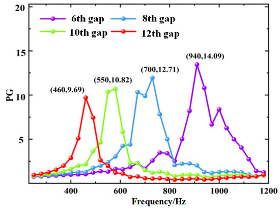 In the experiments, a Micro-Electro-Mechanical Systems (MEMS) microphone is placed at the edge of the central cavity to detect sound signals. The specific positioning method is as follows: the center of the microphone is aligned with the inner wall of the cavity rim, ensuring that the distance between its receiving surface and the cavity rim is 1 mm to maximize the capture of changes in the sound field to detect sound signals. Similarly, in the simulated environment, the probe point is also positioned at the edge of the central cavity to observe the phenomenon of sound enhancement between the air gaps, as indicated by the red points in Figure 3. The selection of the 6th, 8th, 10th, and 12th gaps for testing is based on the following criteria: (1) frequency coverage: the theoretical operating frequency (475–951 Hz) of these gaps covers the typical mechanical failure characteristic frequency band (500–1000 Hz), which is representative of the engineering; (2) structural symmetry: the even-numbered gaps (e.g., 8th, 10th, and 12th) are located on both sides of the centerline of the ZCGM, which can avoid the interference of boundary effects; (3) thermo-viscous loss gradient: the equivalent acoustic ranges of the higher gaps (e.g., 12th gap) are longer, which facilitates the study of the relationship between the loss and the location of the gaps. The sound pressure gain is considered a crucial metric for measuring the effectiveness of sound enhancement. Here, the sound pressure gain (PG) is defined as PG = PM/PF [24], where PM represents the sound pressure amplitude in the ZCGM and PF denotes the sound pressure amplitude in the free sound field. The transmission characteristics of the sound field are simulated. Moreover, due to the mismatch between the sound wave vector and mode field of the first two air gaps in the gradient structure, these gaps are excluded from the analysis in this study. The center frequencies for each air gap (from the third air gap to the last) of the ZCGM structure f (Hz), and the GAMs structure F (Hz), as obtained through simulation, are listed in Table 3. In the experiment, the analysis of sound pressure gain and the acoustic enhancement phenomenon is realized by multi-step signal processing: firstly, the signal is collected by a MEMS microphone and then digitized at a sampling rate of 48 kHz after band-pass filtering and denoising from 100 Hz to 10 kHz; subsequently, the spectral characteristics and peak distribution are analyzed by converting the frequency domain through the FFT; and the signal averaging and standard deviation statistics of the data from multiple experiments are carried out to enhance the reliability.