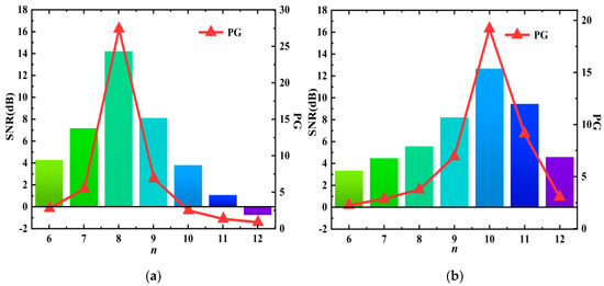 We calculated the acoustic gain and SNR for various target frequencies obtained from gaps six through twelve using the measured data, as illustrated in Figure 10. Specifically, Figure 10a presents the PG and SNR for the target frequency of 700 Hz captured by each gap, while Figure 10b displays the PG and SNR for the target frequency of 550 Hz across the same gaps. For the 700 Hz signal, the maximum SNR and gain factors are achieved at gap eight, with values of 14.32 dB and 26.21 times, respectively. Conversely, for the 550 Hz signal, the highest SNR and gain factors are recorded at gap ten, yielding values of 12.82 dB and 19.28 times, respectively. These results indicate that the amplification frequency range of the ZCGM is characterized by individual gap positions, demonstrating strong frequency selectivity and superior sound signal enhancement capabilities.