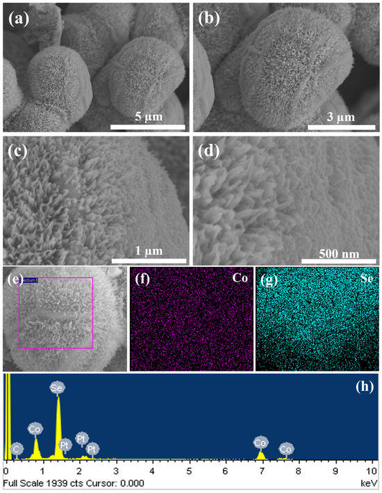 Figure 2 shows FESEM images of the selenized product obtained by the second hydrothermal step. As depicted in Figure 2a, the morphology of the Co0.85Se structure resembles the Co(OH)F microcrystals; however, during the selenization process, the interconnected microcrystals transform into a hierarchical microsphere-like structure (Figure 2b). High-resolution FESEM images reveal the unique surface microstructure of Co0.85Se microspheres (Figure 2c). These microspheres comprise numerous spike-like subunits on their surfaces, which aggregate to form the characteristic hierarchical structure—a unique feature attributed to the selenization process. The high magnification image (Figure 2d) further highlights the rough protuberances on the surface of the Co0.85Se microspheres. This surface morphology, combined with the hierarchical arrangement, enhances material interconnectivity and increases the available active surface area. These structural features are crucial for optimizing charge storage and transfer, making Co0.85Se microspheres particularly suitable for supercapacitor applications [28,32]. Elemental mappings and the EDX spectrum of Co0.85Se are shown in Figure 2e–h, confirming the even dispersion of Co and selenium (Se) throughout the microsphere structure and further supporting the consistent makeup of the material. The small peaks of platinum (Pt) detected in the EDX spectrum of both Co(OH)F microcrystals (Figure 1i) and Co0.85Se (Figure 2h) are attributed to the Pt coating applied during the FESEM analysis.