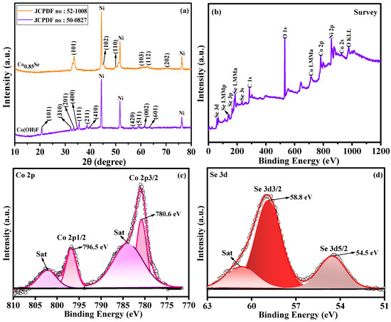 (a) XRD pattern of the Co(OH)F/NF and Co0.85Se/NF electrodes. (b) Survey scan spectrum of the Co0.85Se/NF electrode, and XPS deconvoluted spectra of (c) Co 2p and (d) Se 3d.