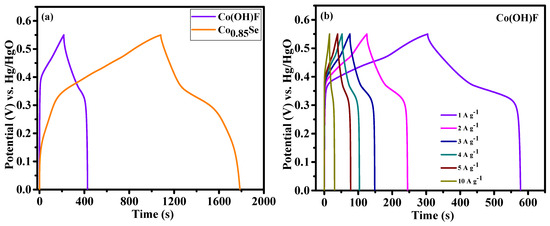 The galvanostatic charge-discharge (GCD) profiles were employed to examine the charge-discharge behavior of Co(OH)F/NF and Co0.85Se/NF electrodes at varying current densities. Figure 6a illustrates a comparison of the GCD profiles for the two materials, recorded within a potential range of 0–0.55 V at a current density of 1 A g⁻¹. The voltage characteristics of both Co(OH)F/NF and Co0.85Se/NF exhibited typical characteristics of battery-type materials, with distinct charge and discharge plateaus. These features correlate with the findings from the CV analysis and suggest a reversible Faradaic process, which is essential to the capacity behavior of these materials. The specific capacities were calculated using Equation (S1). At a current density of 1 A g−1, the specific capacities of Co(OH)F/NF and Co0.85Se/NF were 212.7 and 719 C g−1, respectively. This significant difference in capacity, with Co0.85Se/NF achieving over three times the capacity of Co(OH)F/NF, highlights its superior electrochemical performance at this current density. This improved performance is likely due to the spike-like subunits and rough surface morphology of the Co0.85Se microspheres, which enhanced their conductivity and ion accessibility.