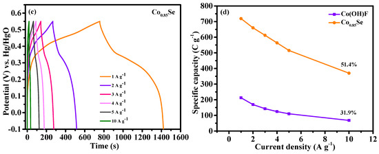 Figure 6b,c show the detailed GCD curves for the Co(OH)F/NF and Co0.85Se/NF electrodes for a range of current densities from 1 to 10 A g−1. The Co0.85Se/NF electrode exhibited remarkable specific capacities of 719, 660, 612, 564, 515, and 370 C g−1 at current densities of 1, 2, 3, 4, 5, and 10 A g−1, respectively. By contrast, the Co(OH)F/NF electrode achieved specific capacities of 212.7, 169.2, 142.8, 124.4, 110, and 68 C g−1 at the same current density. The Co0.85Se/NF electrode exhibited remarkable electrochemical performance, outperforming previously reported Co-based electrode materials. For instance, it outperforms CoSe nanosheets (254.1 C g−1 or 70.6 mAh g−1) [16], Co0.85Se-2 nanosheets (111.6 C g−1 or 31.0 mAh g−1) [25], Co0.85Se thin films (59.2 C g−1 or 16.47 mAh g−1) [31], Co(OH)F-60 (389.9 C g−1) [33], V-doped Co0.85Se nanowire arrays (460.0 C g−1) [36], Ni0.6Co0.4Se (602.6 C g−1) [37], Co(CO3)0.5(OH).0.11H2O (693.0 C g−1) [38], and Co(OH)F/Ni(OH)2 (104.0 C g−1) [39]. This exceptional capacity, maintained across a range of current densities, underscores the outstanding electrochemical characteristics of the Co0.85Se/NF electrode compared with other state-of-the-art materials.