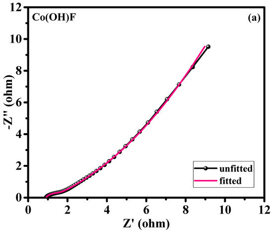 Electrochemical impedance spectroscopy (EIS) analysis offered important insights into the charge transport characteristics of the Co(OH)F/NF and Co0.85Se/NF electrodes. Figure 7a,b show Nyquist plots for both samples measured across a frequency spectrum of 0.01–100 kHz. These Nyquist diagrams were analyzed using the suggested equivalent circuit model (Figure S2), and the obtained parameters are summarized in Table 1. The Co0.85Se/NF electrode exhibited lower internal resistance (Rs) and charge transfer resistance (Rct) values of 0.48 Ω and 0.154 Ω, respectively, compared to the Co(OH)F/NF electrode (0.87 Ω and 0.43 Ω). This result indicates superior electrical conductivity and faster electron transport in the Co0.85Se/NF electrode. The reduction in Rct for Co0.85Se/NF is due to the selenization process, which enhances the intrinsic conductivity of the electrode by incorporating selenium into the structure. This modification facilitates more efficient electron transfer at the interface between the electrode and the electrolyte, which is crucial to improving energy storage performance. Additionally, the Rs values representing the combined resistance of the electrolyte, electrode, and contact interfaces, was slightly lower for Co0.85Se/NF than for Co(OH)F/NF. The slightly lower Rs value for Co0.85Se/NF reflects improved contact and ion transport pathways. The Nyquist plots corroborate these findings, as evidenced by the reduced semicircle diameter in the high-frequency region for Co0.85Se/NF, which corresponds to its lower Rct. In summary, the lower Rs and Rct values for Co0.85Se/NF indicate enhanced conductivity and superior charge transport dynamics, which significantly contribute to its superior electrochemical performance compared to Co(OH)F/NF. These EIS findings align with the CV and GCD results presented in the previous sections, further supporting the improved performance of the Co0.85Se/NF electrode.
