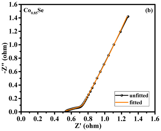 Nyquist plots measured in a three-electrode system: (a) Co(OH)F/NF electrode and (b) Co0.85Se/NF electrode.