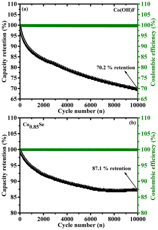 Cyclic performances measured at a current density of 20 A g−1 for 10,000 cycles in a three-electrode system: (a) Co(OH)F/NF electrode and (b) Co0.85Se/NF electrode.