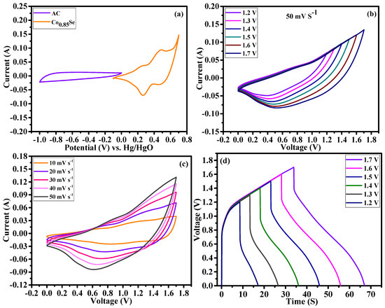 Figure 9a presents the comparative CV curves of the positive (Co0.85Se) and negative (AC) electrodes, recorded at a scan rate of 10 mV s−1 in a three-electrode configuration. The CV profiles highlight the distinct electrochemical characteristics of the two electrodes. The Co0.85Se/NF electrode exhibited Faradaic behavior, as evidenced by the presence of redox peaks, which indicate reversible redox reactions associated with Faradaic processes. In contrast, the AC electrode exhibited non-Faradaic behavior, characterized by a nearly rectangular CV curve, which is characteristic of EDLC.