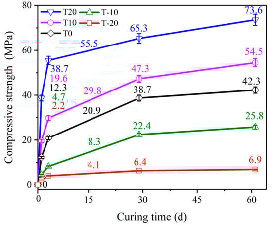 When the curing temperature was reduced to −20 °C (i.e., T-20), the resulting compressive strength after 1 d and 3 d curing decreased to 2.2 MPa and 4.1 MPa, i.e., 53.2% and 50.6% lower than T-10. The compressive strength at 28 d and 60 d reached 6.4 MPa and 6.9 MPa, i.e., 71.4% and 73.3% lower than T-10. The −20 °C curing condition continuously reduced the early compressive strength and severely inhibited the later compressive strength development, which was not seen under the curing conditions of 20 °C to −10 °C, indicating that the AAM condensation reaction almost stopped under the −20 °C condition. When the curing temperature dropped to −20 °C, the time for the T-20 activation solution to reach the freezing point was further reduced, and the inhibiting effect on the condensation reaction was further increased, resulting in a continuous decrease in compressive strength at early ages. More seriously, the curing condition of −20 °C accelerated the freezing of free water in the irregular pores of nano- and microscale in T-20, further limiting the polymerization reaction of GBFS and hindering the formation and development of nano- and microscale polymerization products, resulting in the inability to increase the compressive strength of T-20 in the later stage of curing [].