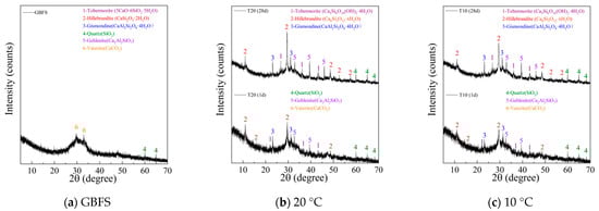 At 20 °C, two main crystal characteristic peaks of hillebrandite (2, CaSi2O5·2H2O, PDF 042-0538) and tobermorite (1, Ca5Si6O16(OH)2·4H2O, PDF 046-1448) appeared in T20 (1 d, Figure 2b). The crystal characteristic peaks of two hydrated calcium silicate minerals, gehlenite (5, Ca2Al2SiO7 PDF035-0755) and gismondine (3, CaAl2Si2O8·4H2O PDF020-0452), also appeared in T20, indicating the formation of calcium silicoaluminate crystal structures in T20 (1 d), which is crucial for early-age strength development []. This also confirms that under suitable temperature conditions, active lime, silica, and alumina from GBFS undergo depolymerization and re-condensation to form calcium silicate and calcium silicoaluminate crystals, promoting enhanced mechanical properties []. In the later curing stage, the characteristic peak intensities of 1 and 2 significantly increased in T20 (28 d), while those of 3 and 5 also showed a similar increase. However, the characteristic peak intensity of quartz (4, SiO2, PDF 078-2315) crystal did not further improve. The above shows that at 20 °C, the depolymerization of GBFS and the polycondensation of active substances continue with the increase in curing age, the crystallinity of calcium silicate and calcium aluminosilicate continue to improve, and the continuous growth and strengthening of the gel structure promote the compressive strength development.