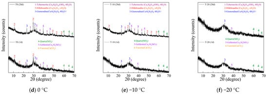 When the curing temperature dropped to −10 °C, the characteristic peaks of 1 and 2 no longer appeared in T-10 (1 d, Figure 2e). However, the characteristic peaks of 3 and 5 could still occur, but the intensity of the characteristic peaks (1, 2, 3, 5) was significantly reduced. Due to the influence of a −10 °C temperature environment, calcium silicate cannot form within 1 d, while calcium silicoaluminate can still condense and form []; however, the amount of formation is significantly reduced, resulting in substantially decreased compressive strength. As the curing duration increases, although characteristic peaks of 1 and 2 appear in T-10 (28 d, Figure 2e), the intensity is extremely weak, indicating that although calcium silicate products are formed in the later stage, the crystallinity is too poor. The formation amount is insufficient, so it cannot play a role in increasing compressive strength. However, the characteristic peaks of 3 and 5 increased significantly, but the growth rate was lower than T0 (28 d). Although the condensation reaction of calcium silicoaluminate in the later stage can continue to complete and the generated amount continues to increase, the efficiency of the condensation reaction has decreased, resulting in reduced compressive strength development in the later stage [].