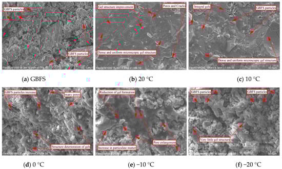 When the curing temperature drops to −10 °C, the granular materials in the microstructure of T-10 (28 d) increase significantly, while the gel structures are only formed in local areas, and the microstructure is only maintained by GBFS interparticle bonding (Figure 3e). Meanwhile, the number of micropores continues to increase, and the pore diameter significantly increases, indicating that the degree of polycondensation reaction of GBFS particles is further reduced, the amount of gel formation is decreased considerably, and the unreacted GBFS particles cannot be wrapped, let alone the fact that the micropores cannot be effectively filled []. Therefore, the continuous reduction in curing temperature leads to a continuous decrease in gel volume and persistent microstructure deterioration, severely jeopardizing compressive strength development.