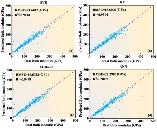 Scatterplot of the prediction results of bulk modulus by four algorithms. (a) SVR; (b) RF; (c) XGBoost; (d) ANN.