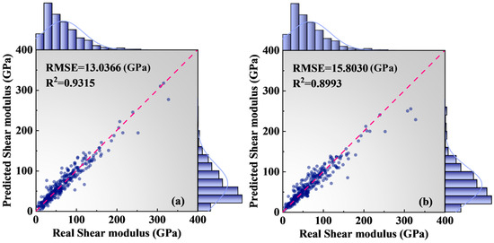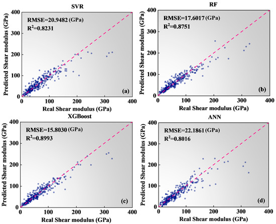 The predictive performance of all four models for the shear modulus is slightly lower than that for the bulk modulus. As shown in Table 5, XGBoost remains the most accurate model, achieving an R2 value of 0.8993 and the lowest RMSE of 15.803 on the test set. The RF model follows closely behind, demonstrating a comparatively strong predictive performance. In contrast, the ANN and SVR models exhibit the poorest predictive accuracy, with RMSE values exceeding 20, indicating substantial discrepancies between predicted and actual values.