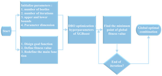 By simulating the four fundamental behaviors of dung beetle populations and leveraging swarm intelligence optimization principles, the DBO algorithm conducts an automated and highly efficient exploration of the hyperparameter space. This approach facilitates the rapid and precise identification of the optimal hyperparameter configurations for the XGBoost model, significantly enhancing both model performance and computational efficiency. The implementation workflow is schematically illustrated in Figure 3.