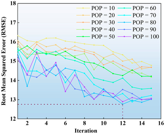 In the DBO, the population size (POP) and number of iterations (Iteration) are the two critical parameters that determine the search efficiency and exploration capability of the algorithm. Increasing POP and Iteration expands the number of dung beetle individuals participating in the search, thereby enhancing the coverage of the search space. As a result, exploring different combinations of population sizes and iteration numbers allows for a more comprehensive optimization of the XGBoost model’s hyperparameters. An analysis of the dataset revealed that the bulk modulus and shear modulus distributions exhibit different degrees of variability. Consequently, the hyperparameters of the predictive models for bulk and shear modulus must be individually optimized to ensure optimal predictive performance for both properties. To optimize the XGBoost-based bulk modulus prediction model, the RMSE on the test set was used as the fitness function. The number of iterations varied from 1 to 15, while the population size ranged from 10 to 100. The optimization results are presented in Table 6.