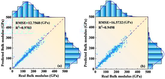 To better compare the changes in model performance before and after optimization, the regression curves of the unoptimized XGBoost model were also plotted using the same dataset, and the results are shown in Figure 5b. A comparison between Figure 5a,b clearly demonstrates that the DBO-XGBoost significantly improves its generalization ability, yielding higher prediction accuracy and a more compact distribution of scatter points. The R2 and RMSE values for the hybrid model in predicting bulk modulus are 0.9703 and 12.7568, respectively. These results indicate that the hybrid model is able to more accurately learn the underlying patterns from the dataset, exhibiting greater reliability in predicting the unknown dataset, thus making it more suitable for bulk modulus prediction.