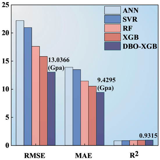 To further assess the effectiveness of the DBO algorithm for optimization, the performance of DBO-XGBoost was compared with the four other machine-learning models in this study, utilizing stochastic hyperparameters. The statistics of the model prediction results for bulk modulus on the test set are shown in Figure 6, where RMSE, MAE, and R2 are used as evaluation metrics. The figure clearly shows that the DBO-XGBoost model has the lowest RMSE (12.7568) and the highest R2 (0.9703) for bulk modulus predictions compared to the other four machine-learning models. This demonstrates that the DBO algorithm can effectively and accurately identify the optimal hyperparameter combinations for the XGBoost model, significantly enhancing the model’s prediction performance.