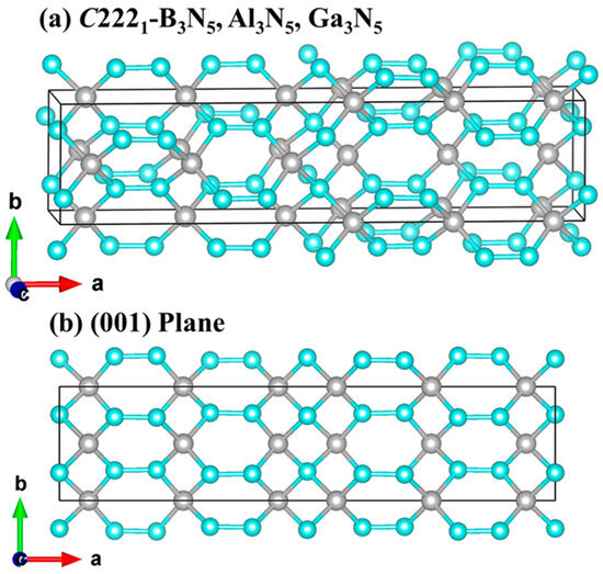 The crystal structures of X3N5 (X = B, Al, Ga) polymorphs in the C2221 phase (a), along the (001) direction (b).