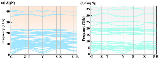 For the purpose of inspecting the dynamic stabilities, phonon spectra of C2221-X3N5 (X = B, Al, Ga) polymorphs are studied during this work. Figure 10 exhibits phonon spectra of C2221-Al3N5 and C2221-Ga3N5, and that of C2221-B3N5 is displayed in Ref. [63]. As is clearly indicated by Figure 10 and Ref. [63], the whole Brillouin zone does not show any negative frequency of phonon spectra, indicating that the C2221-X3N5 (X = B, Al, Ga) polymorphs are dynamically stable at ambient pressure.
